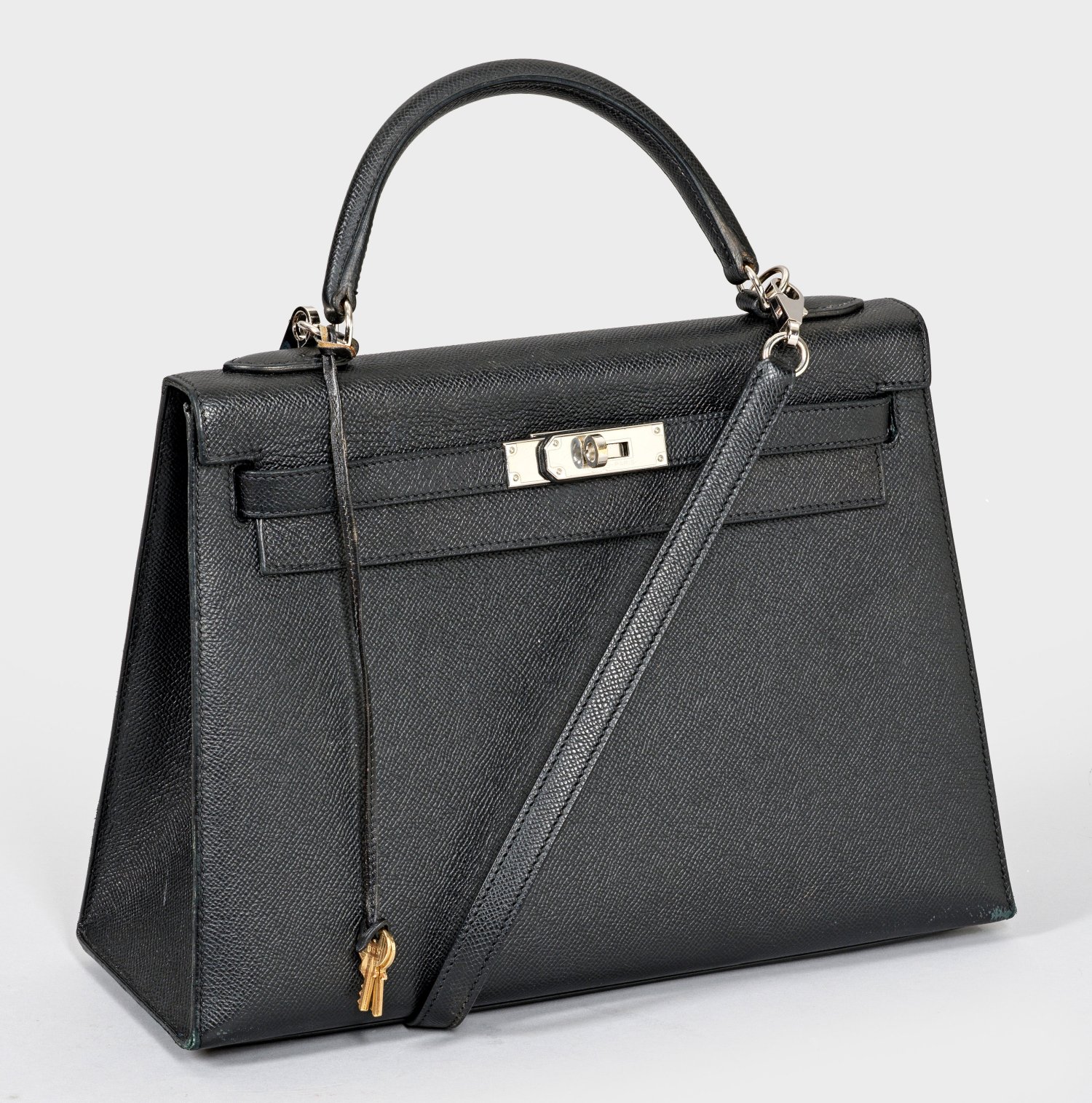 A black leather Hermès "Kelly Bag 32". Lock missing. Manufacturer's mark. Box. Invoice included.