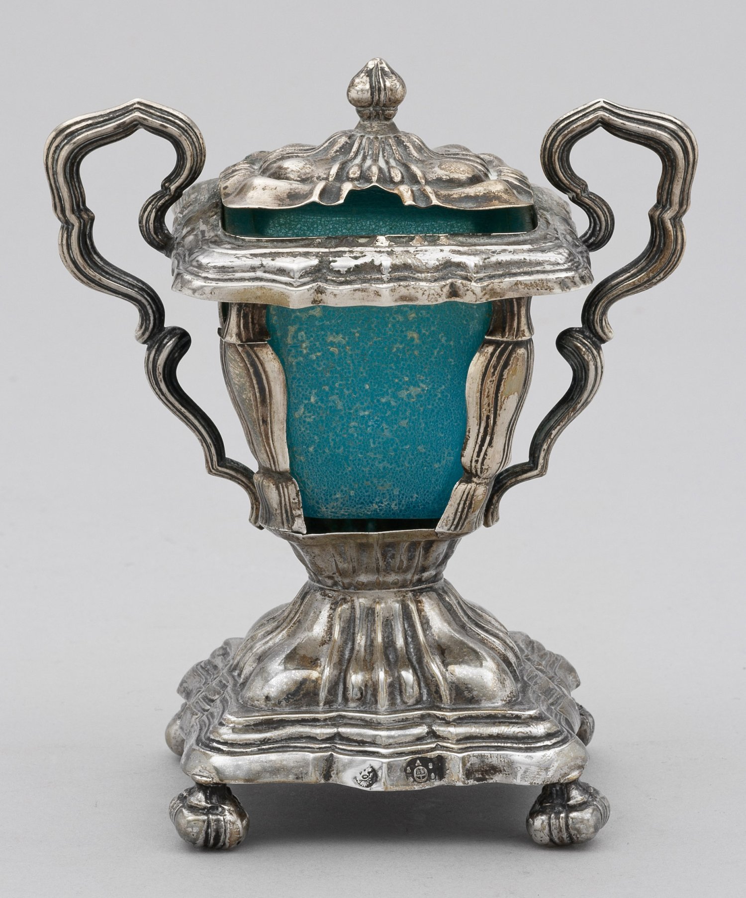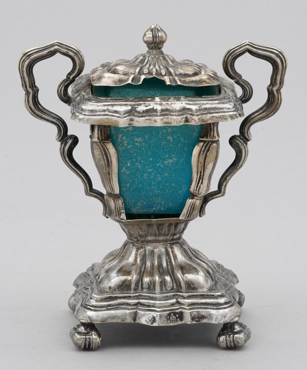 Silber. Über vier Kugelfüßen quadratischer Stand. Konische Kuppa mit hellblauem Einsatz, wohl aus Glas. Ohrenhenkel und scharnierter Deckel mit Balusterknauf. Korpus gegliedert von vertikalen Zügen. Gest. 13 Lot, Beschauzeichen, dat., Meister Jakob Weiss (wird Meister 1833). Ges.-Gew. ca. 155 g. H. 12,5 cm.