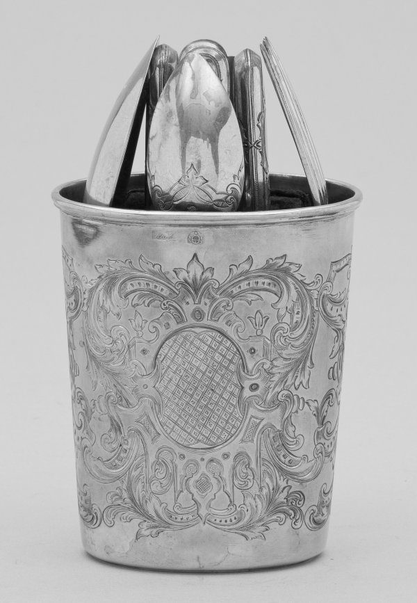 Silber. 6-tlg.; Becher, Tabatiere sowie Speisemesser, -gabel und -löffel, Dessertlöffel, mittig faltbar. Umlaufender Akanthusblattdekor sowie monogr. "OW" unter Grafenkrone. Teilw. innen vergoldet. Gest. 13 Lot, Beschauzeichen, Herstellerzeichen. Gew. zus. ca. 375 g (Gew. ohne gefüllte Teile ca. 185 g). L. 5 cm - 21. H. 3,5 cm - 10,5 cm.