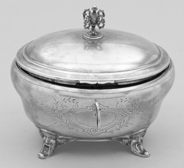Silber. Auf vier Maskaronenfüßen ovaler Korpus mit Scharnierdeckel. Durchbrochen gearbeiteter Knauf. Schauseitiges Schloss, gerahmt von Kartusche, gravierten Voluten und Blättern. Innen vergoldet. Mit Schlüssel. Gest. 800, Meisterzeichen "G?", Linzer Importmarke (ab 1891). Gew. ca. 265 g. H. 11 cm. 13 cm x 10 cm.