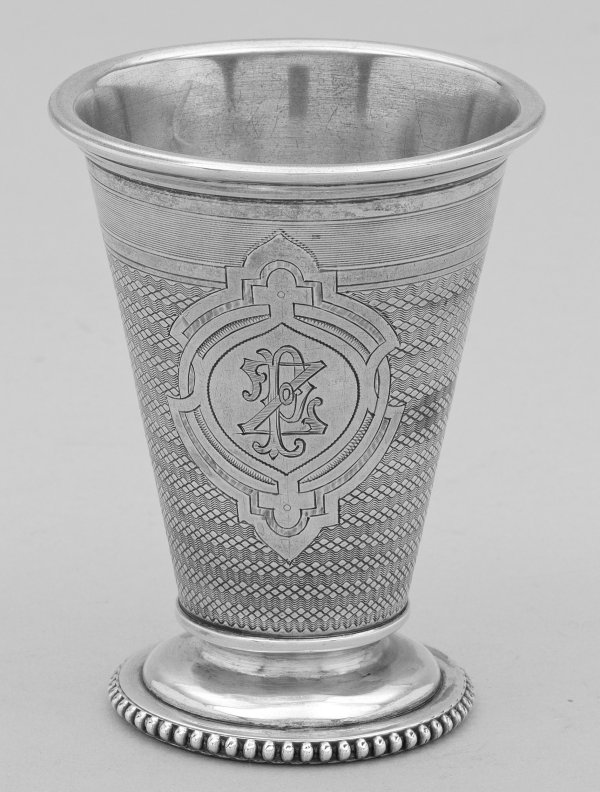 Silber. Ausgestellter Rundstand, umzogen von Perlfries, übergehend in stark konischen Becher mit mehrfach profiliertem Lippenrand. Schauseitig graviertes Monogramm "ZP". Die Wandung verziert mit gleichmäßig feinem guillochiertem Wellen- und Liniendekor. Gest. 84, Beschauzeichen, Beschaumeister A. Swetschin (1862-1875). Gew. ca. 110 g. H. 9,5 cm.