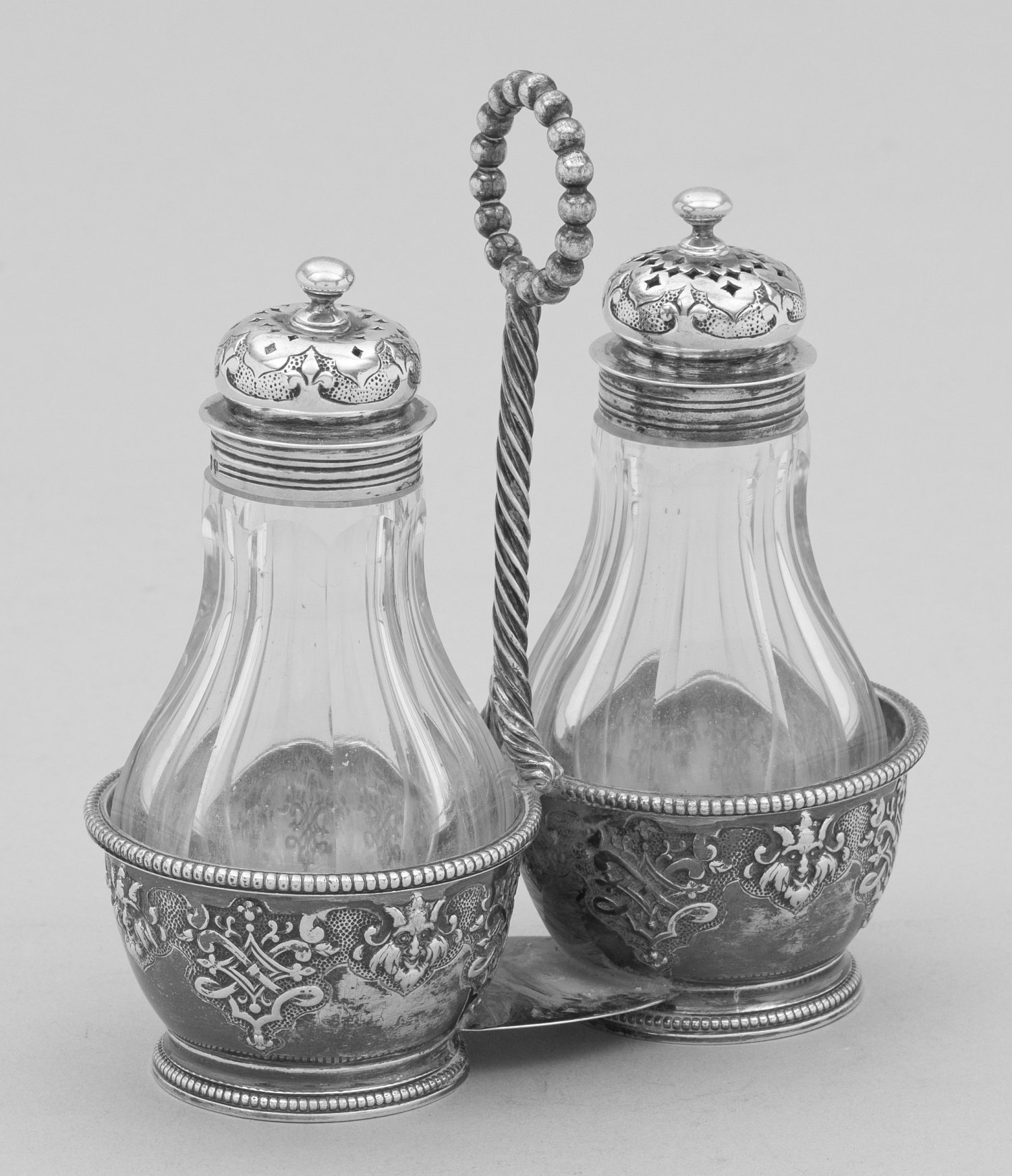 Sterlingsilber und farbloses Glas. Zwei runde Körbchen als Haltevorrichtung für Salz- und Pfefferstreuer mit Silbermontierung. Wandung mit Maskarons und Bandelwerk auf punziertem Grund. Glas best.; Gest. Beschauzeichen, Herstellerzeichen, Jahresbuchstabe "T". Gew. ohne Glaseinsatz ca. 115 g. H. 11 cm. L. 10 cm.