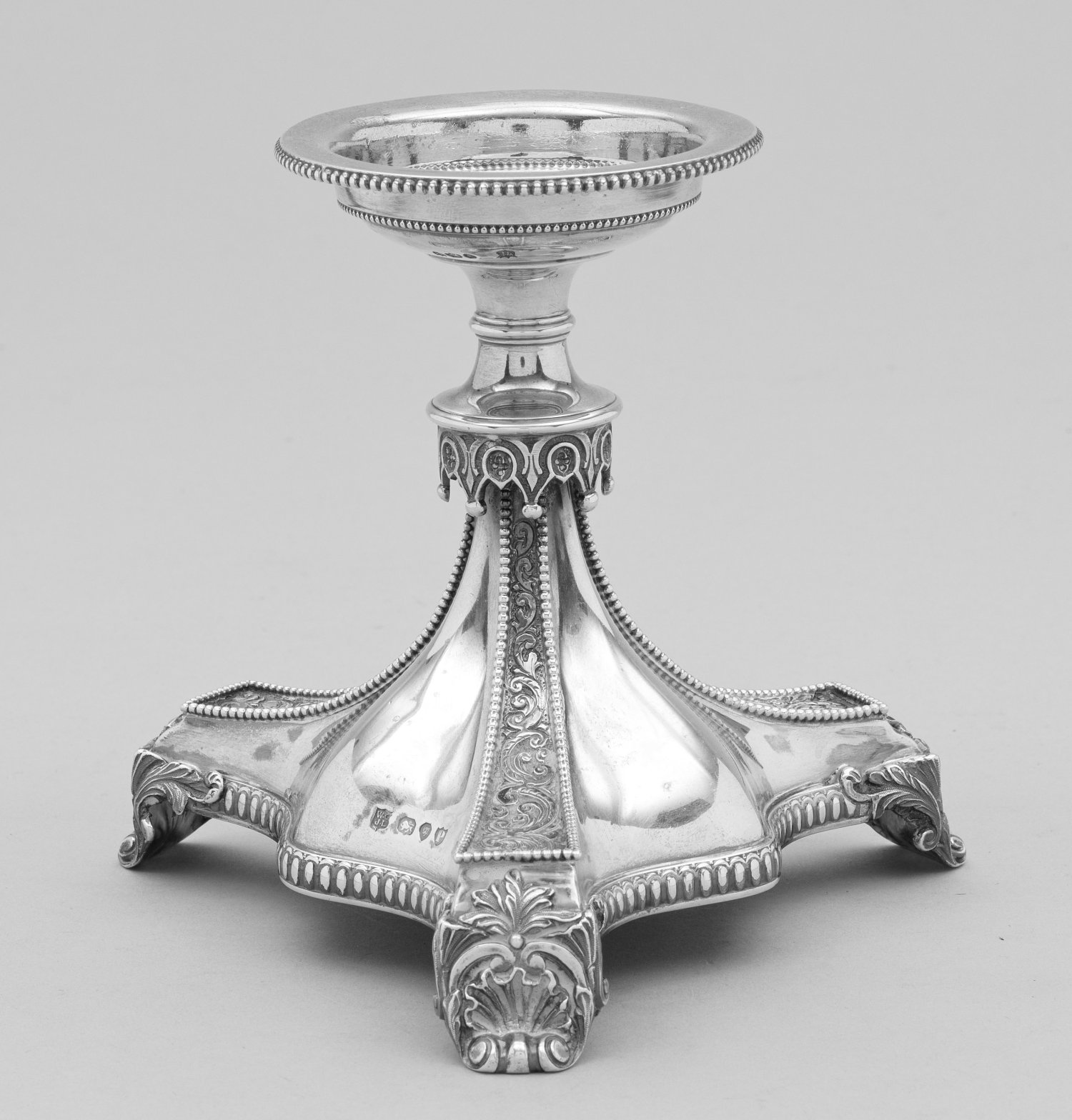 Sterlingsilber. Über drei volutierten Füßen geschweifter, dreieckiger Korpus, übergehend in profilierten Schaft und runde Kuppa mit ausgestelltem Rand. Schaft und Füße verziert mit Voluten, Muschelwerk und Blattdekor. Die Ränder akzentuiert mit Perlfries. Gest., Beschaumarke, Herstellerzeichen, Jahresbuchstabe "p". Gew. ca. 320 g. H. 14 cm.
