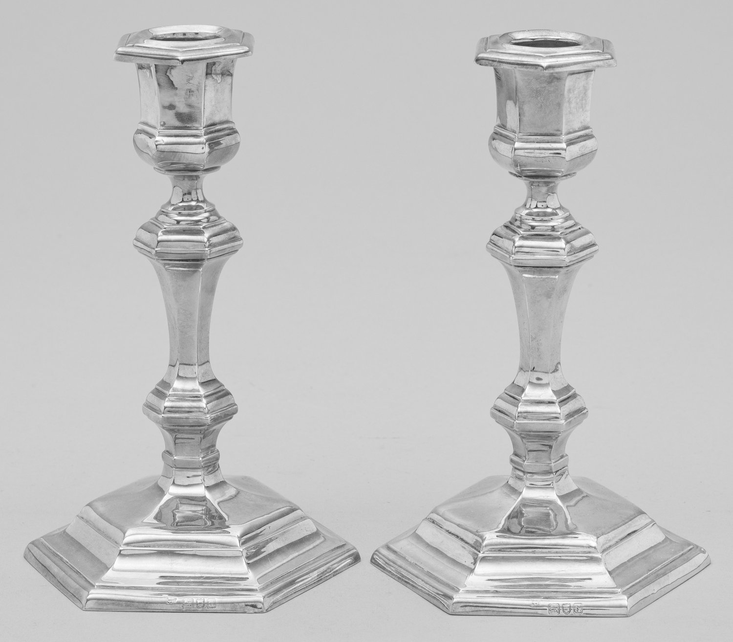 Sterlingsilber. Sechsfach gekanteter Stand, übergehend in korrespondierenden Balusterschaft mit zylindrischer Tülle und herausnehmbarer Traufschale, beschwert. Modell-Nr. 8592. Gest., Beschaumarken, Herstellerzeichen, Jahresbuchstabe "d". Gew. zus. ca. 735 g. H. 17,5 cm.
