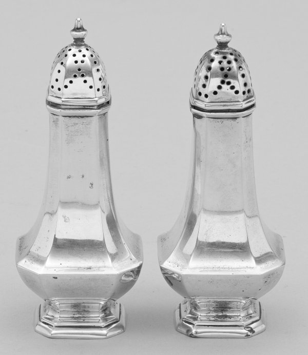 Sterlingsilber. Randprofilierter, achteckiger Stand. Achteckiger, balusterförmiger Korpus mit abgesetzter, leicht gerundeter Schulter und kleinem Knauf. Minim. besch.; ein Deckel fest. Gest. "Sterling", Herstellerzeichen, Modell-Nr. 298121. Gew. zus. ca. 150 g. H. 14 cm.