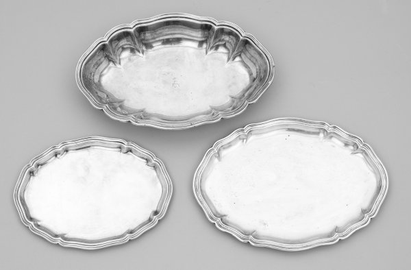 Silber. Querovale Form. Flacher bzw. vertiefter Spiegel, übergehend in blütenförmig geschweifte Fahne mit gering ausgestelltem Rand. Teilw. mit graviertem, vereinfachtem Wappenschild mit steigendem Bär und Helmzier mit Straußenfedern. Modell-Nr. "327923", und "2718 (D. 24/18)". Gest. 800, 830, 835. Herstellerzeichen. Gew. zus. ca. 955 g. D. 24 cm - 31,5 cm.