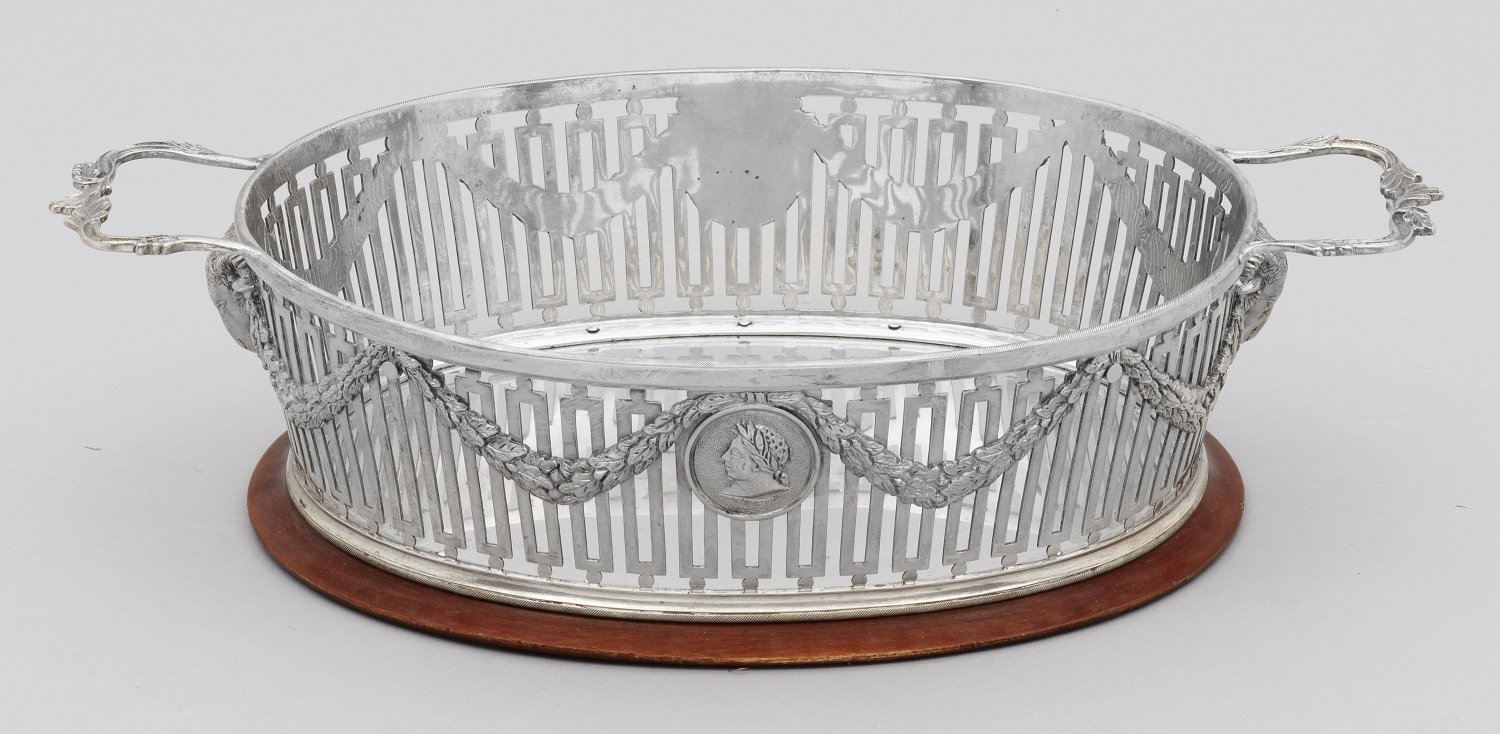 Silber und Holz. Ovaler Stand aus rötlichem Holz. Darauf befestigt ein ovaler Korb. Die Wandung in Form von Stabfries durchbrochen gearbeitet, umlaufend verziert mit reliefierten Lorbeerblattfestons. Die Längsseiten mit runden Porträtmedaillons, die Kurzseiten unter volutierten Handhaben mit Ziegenbockköpfen verziert. Gest., teilw. undeutliches Beschauzeichen mit Exportmarke bis 1953. Gew. ca. 1150 g. H. 8 cm. 33,5 cm x 20,3 cm.