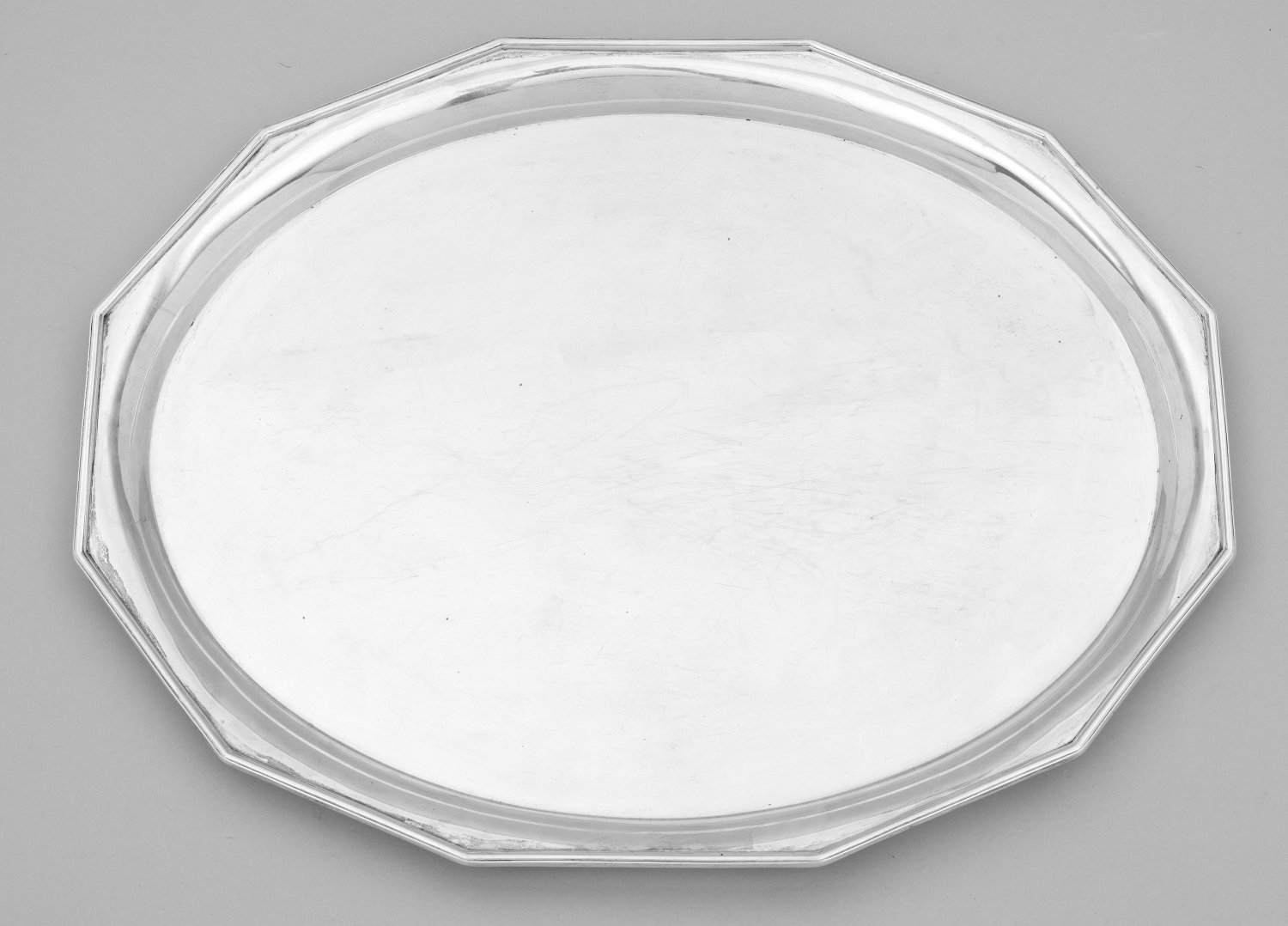 Silber. Ovaler, glatter Spiegel mit leicht ansteigender, zwölfeckiger Fahne und profiliertem Rand. Gest. 800, Beschau- und Herstellerzeichen. Minim. Gebrauchsspuren. Gew. ca. 805 g. 39,5 cm x 31cm.