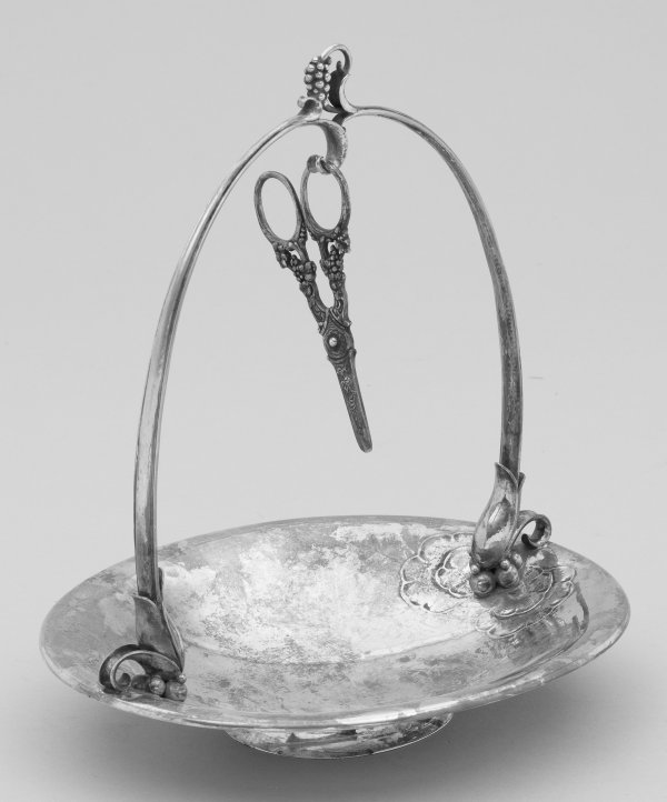 Sterlingsilber. Auf schmalem, ausgestelltem Fuß ovale leicht gemuldete Schale mit gerundetem Rand. Aus zwei gegenüberliegenden, plastisch gearbeiteten Tulpenknospen aufragend hoher, gerundeter Henkel, mittig bekrönt von einer Weinrebe zwischen volutenförmigen stilisierten Blättern. Gest. 925 sowie "Denmark Sterling", Entwerfer-Monogramm "Dessin HN" für Entw. Harald Nielsen, Herstellerzeichen, Modell-Nr. 543. Gew. ca. 660 g. H. 25 cm. 22 cm x 19 cm. Als Beigabe eine Zierschere.