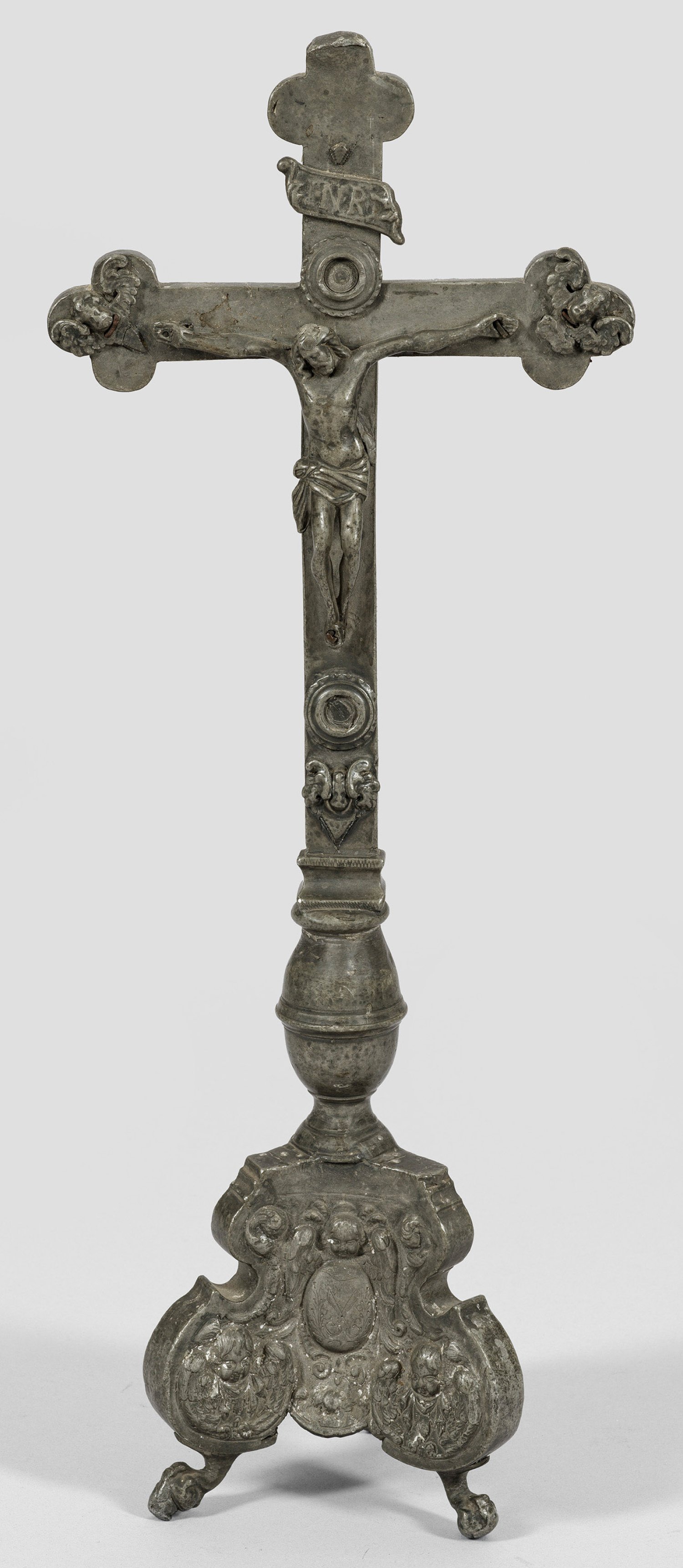 Auf drei Füßen dreipassige, geschweifte Basis, darüber Kruzifix. Basis und Querbalken mit Puttenköpfen reliefiert. Auf Basis in drei Kartuschen graviert überkreuzte Degen, "D. M", "D.S" "F. K", "F. B" und dat. 1740. Rest.; H. 52 cm.