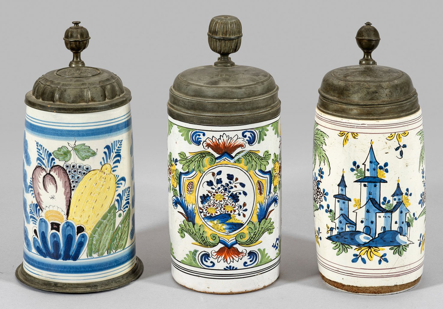 Fayence. Unterschiedlicher, polychromer Scharffeuerdekor mit Blumen in Kartusche, Früchtebukett und Landschaft. Zinndeckel mit Monogramm und Namensinschrift bzw. Reliefmedaillon mit szenischer Darstellung eines jüngeren Paares und altem Mann sowie korrespondierender Inschrift "Ich waerme balt, der Alt ist kalt" (in Versalien), teilw. dat. 1745 und 1771. H. 25,5 cm-26,5 cm.