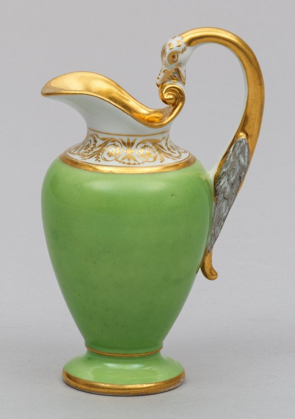 Über Scheibenfuß ovoider Korpus. Seitlich hochgezogener Tierkopfhenkel mit teilw. silberfarben reliefiertem Gefieder. Gerundete Schulter mit helmförmigem Ausguss. Apfelgrüner Fond. Goldstaffage. Unw. ber.; Schwertermarke. H. 13 cm.