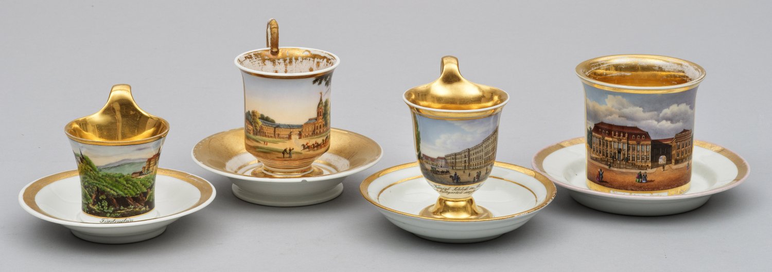 mit erg. Untertassen. 4-tlg.; Walzen,- Glockenbecher- und Campanerform. Schauseitig der Wandung Ansicht Königlicher Palais in Berlin, Schloss Fürstenstein in Waldenburg (Schlesien), und Schloss Charlottenburg in Berlin. Polychrome Malerei mit Goldstaffage. Erg. Untertassen (u.a. Meissen, Carl Tielsch). Überwiegend bez.; Ber.; Partiell best./Haarriss. Teilw. minim. rest.; Zeptermarken, teilw. mit Malereimarke, Manufakturmarke u. ungemarkt. Tassen-H. 8 cm - 11 cm.