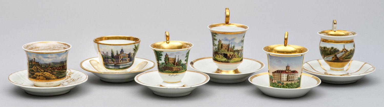 mit erg. Untertassen.; 6-tlg.; Verschiedene Formen, darunter Glockenbecher- und Walzenform. Teilw. seitlich hochgezogene Volutenhenkel. Schauseitig in goldgerahmtem Rechtecksfeld drei Ansichten von Schloss Fürstenstein, eine Ansicht des Herkules in Kassel, eine Stadtvedute von Bielefeld sowie die Ansicht des Marmor Palais in Potsdam. Feine polychrome Malerei mit reicher Goldstaffage. Erg. Untertassen verschiedener Hersteller. Eine Tasse ungemarkt. Ber.; Partiell minim. best./rest; Verschiedene Zeptermarken. H. 7 cm - 12,5 cm.