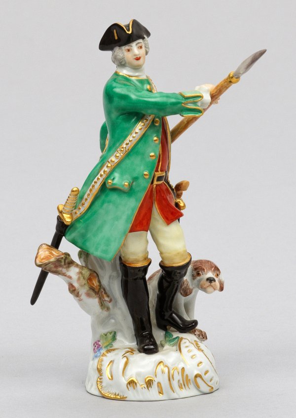 Auf Rocaillesockel stehender Jäger im Gehrock mit Dreispitz, in den Händen eine Wildschweinlanze, zu seinen Füßen ein Hund. Polychrome Malerei mit Gold. Entw. Friedrich Elias Meyer. Modell-Nr. 63022. Rest.; Schwertermarke. H. 14,5 cm.