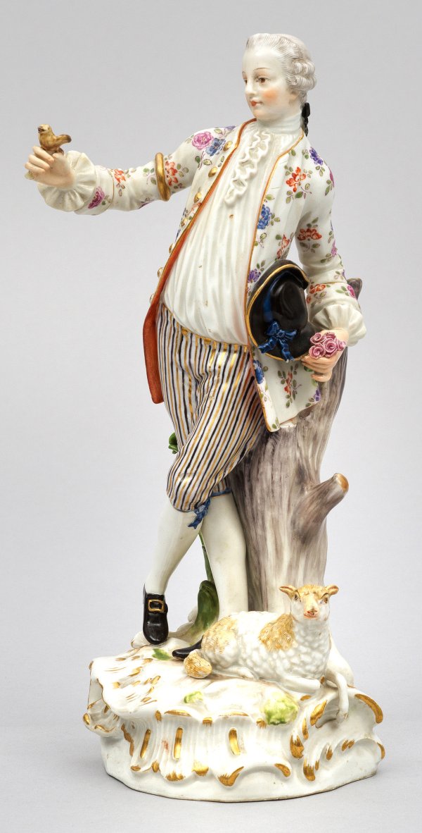 Auf Rocaillesockel an einen Stamm gelehnter Schäfer in Indianischem Gewand, in der rechten Hand einen Vogel, mit der linken Hand Hut und Rosenstrauß haltend. Ein Schaf zu seinen Füßen liegend. Polychrome Malerei mit Goldstaffage. Entw. Johann Joachim Kaendler. Modell-Nr. 6. Rest./Best.; Schwertermarke. H. 26,5 cm.