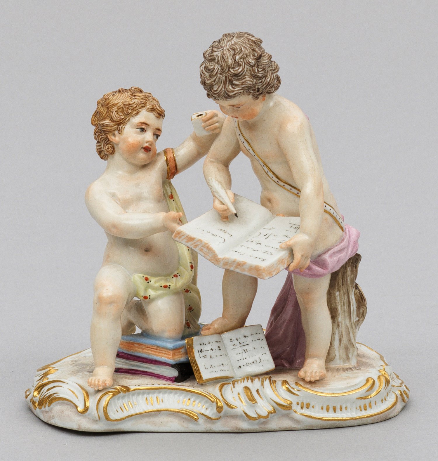 Rocaillesockel. Auf Bücherstapel knieender Putto dem Knaben mit Schreibtafel und Füllfederhalter das Tintenfaß reichend. Polychrome Malerei mit Goldstaffage. Entw. Michel Victor Acier. Modell-Nr. C 36. Best.; Schwertermarke. H. 12 cm.