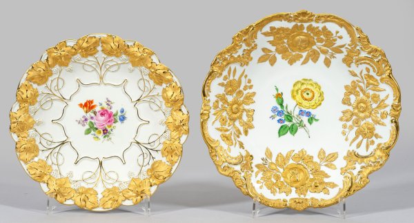 Runde, gemuldete Form mit passig geschweiftem Rand. Reliefierte Rocaillereserven und Blumenbuketts bzw. Weinrebendekor in sog. Goldbronze. Im Spiegel farbige Blumengebinde in polychromer Malerei. Entw. Ernst August Leuteritz. Modell-Nr. Z 98 I und Z 99. Schwertermarke. D. 27 cm - 31 cm.