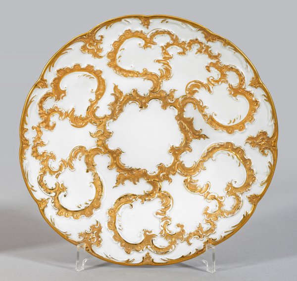 Runde, gemuldete Form mit passig geschweiftem Rand. Mit ausgesparten, reliefierten Rocaillereserven in sog. Goldbronze. Goldstaffage. Entw. Ernst August Leuteritz. Modell-Nr. C 139. Unw. ber.; Schwertermarke. D. 28 cm.