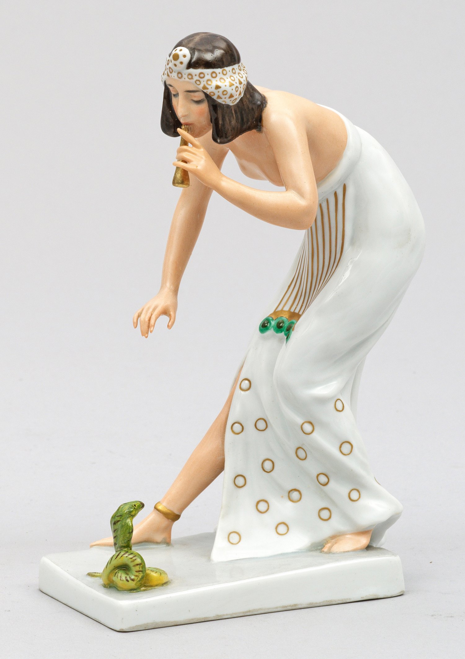 Auf rechteckigem Sockel stehende Tänzerin in ägyptisierendem Gewand beim Beschwören einer Kobra. Polychrome Malerei mit Goldstaffage. Entw. Berthold Boeß, 1916. Modell-Nr. K. 442. Entw.-Bez.; Rest.; Manufakturmarke. H. 20 cm.