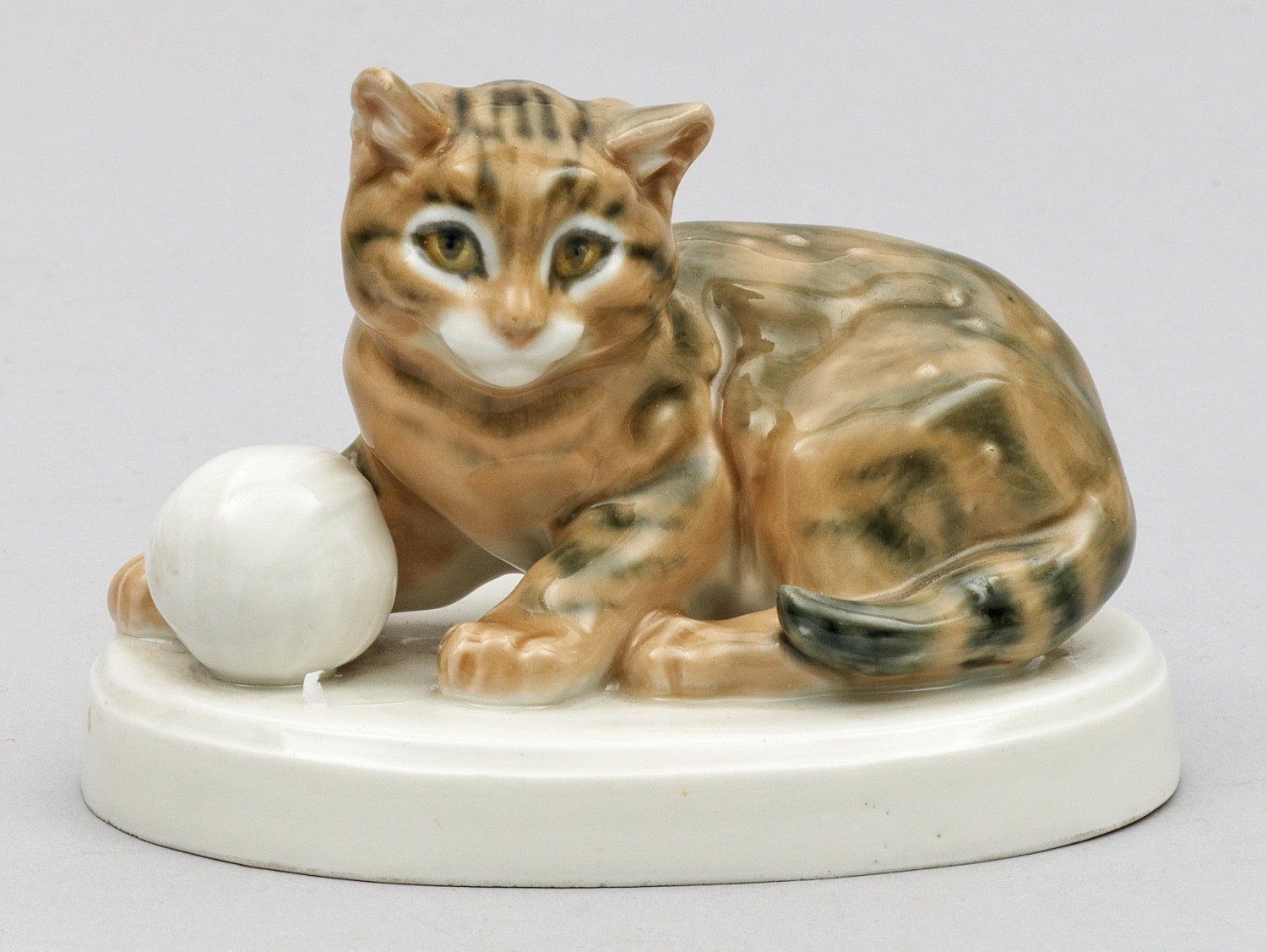 Auf ovaler, leicht profilierter Plinthe sitzende Katze, mit einem Wollknäuel spielend. Naturalistische Unterglasurmalerei. Entw. Erich Hösel, 1917. Modell-Nr. V 171. Äußerst minim. best.; Schwertermarke. H. 8,5 cm. L. 11 cm.
