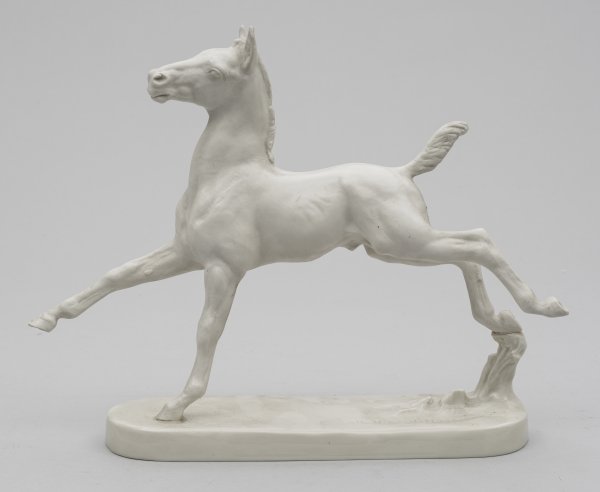 A partly porcelain and biscuit porcelain figure titled trotting foal designed by A. H. Hussmann. Restored. Manufacturer's mark.