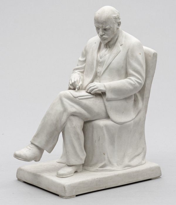 Biskuitporzellan. Rechteckssockel. Auf einem Stuhl sitzender, die Beine überschlagener Politiker Wladimir Iljitsch Lenin in Anzug mit konzentrieter Miene bei der Niederschrift. Ber.; Manufakturmarke. H. 35 cm.