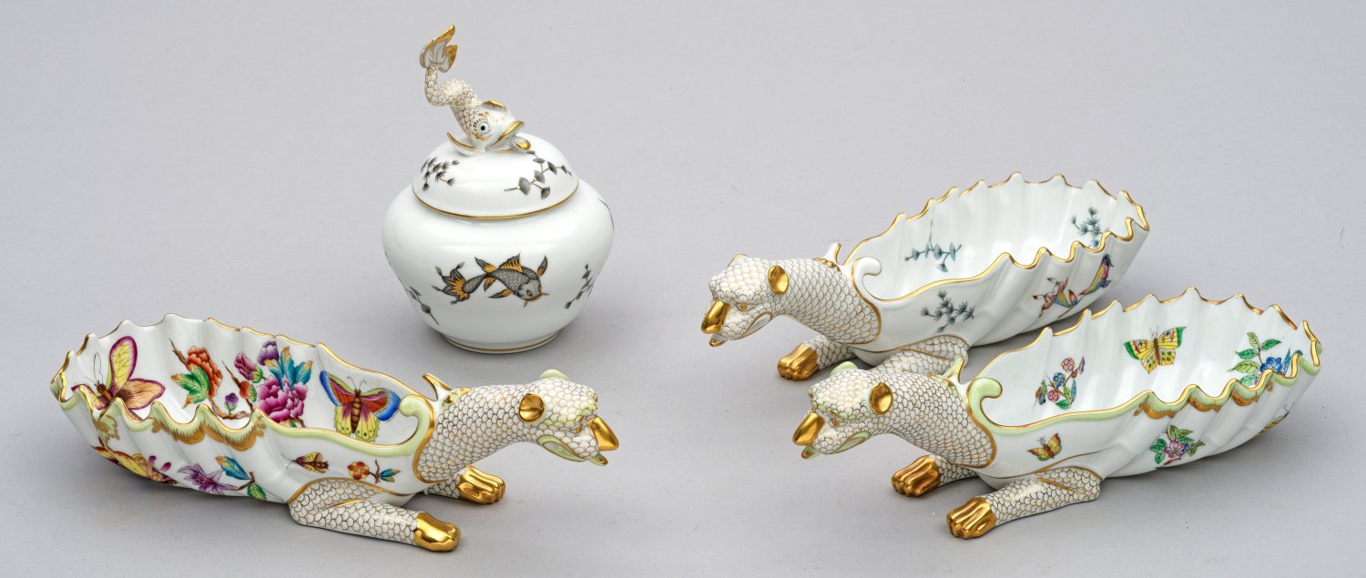 Verschiedene, farbenprächtige Dekore mit Fischen bzw. dem "Victoria" Muster aus Päonienzweigen und Schmetterlingen. Polychrome Malerei mit Umdruck. Goldstaffage. Manufakturmarke. Drachen-L. 28 cm. Dosen-H. 16 cm.