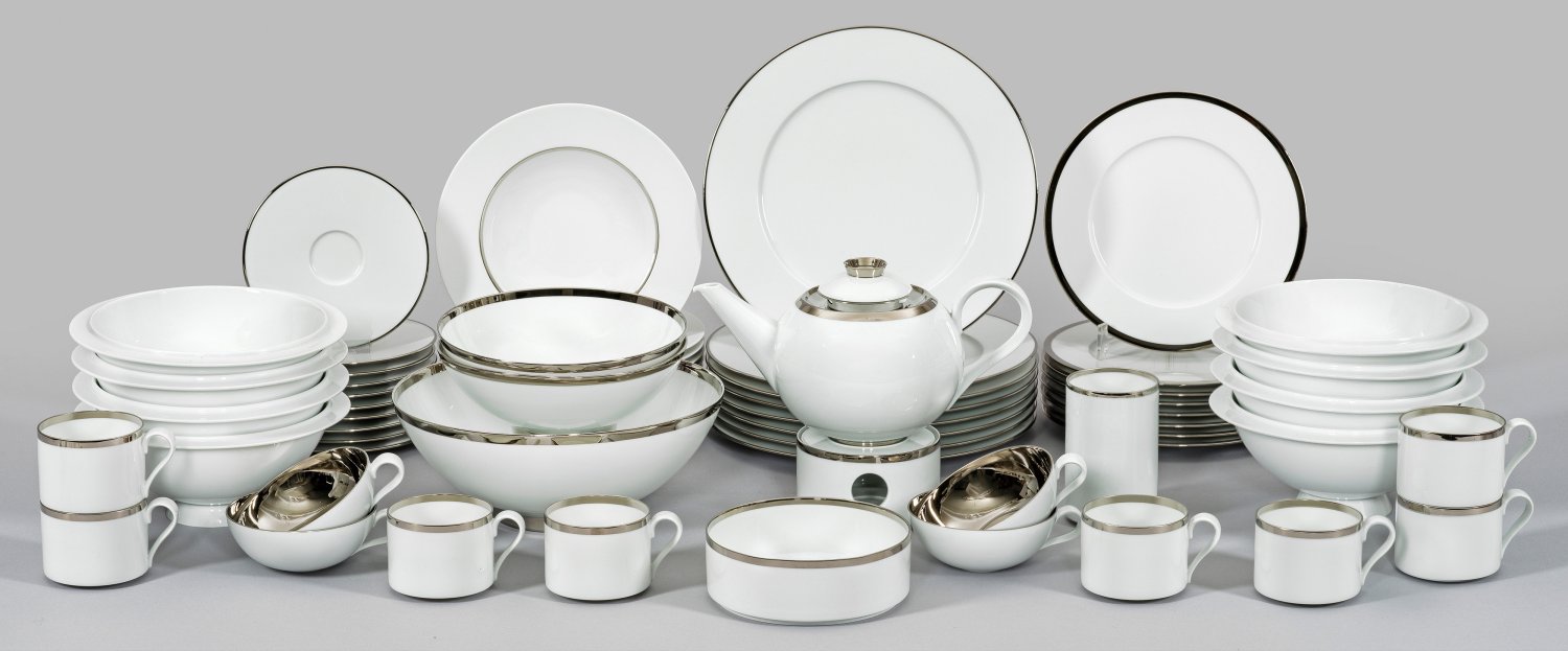 für bis zu 8 Personen. 51-tlg.; Teekanne mit Teesieb, 8 Kaffeetassen mit Untertassen, 4 Teetassen, zylindrische Vase, Rechaud mit abnehmbarem Deckel, flache Schale, 8 Suppenteller, 8 weiße Schüsseln mit breitem Rand, 2 kleine ovale Schüsseln, große ovale Schüssel, 8 flache Mittel-, 8 flache Platzteller. Als Beilage zwei Untertassen. Weißporzellan, überwiegend mit Platinrand. Entw. Michael Sieger. Teilw. minim. best.; Bez. " * Sieger by Fürstenberg". Prägemarke Stern bzw. Manufakturmarke. Kannen-H. 13 cm, Platzteller-D. 29 cm.