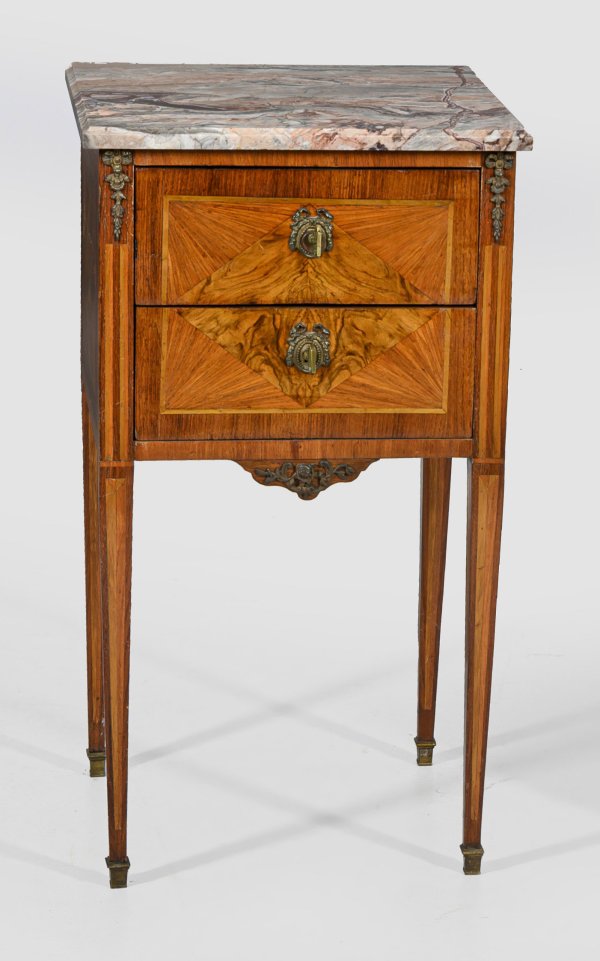 Palisander und Nussbaum, furniert. Gerader, rechteckiger Korpus auf hohen, konischen Vierkantbeinen. In der gegliederten Front zwei Schubfächer sans traverse. Flächendeckend breit gerahmte Furnierfelder. Gering überstehende Deckplatte aus roséfarbenem Marmor. H. 80 cm. 44 cm x 37,5 cm.