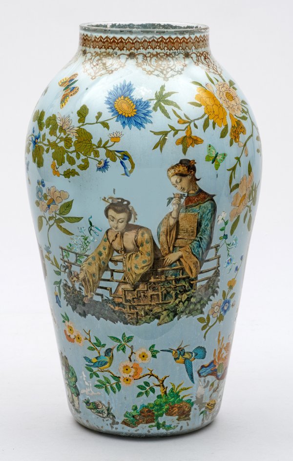 Balusterförmiger Vasenkorpus aus farblosem Glas. Von innen aufgeklebt und von hellem Grund hinterfangen verschiedene polychrome Chinoiserie-Motive. Ber.; H. 42 cm