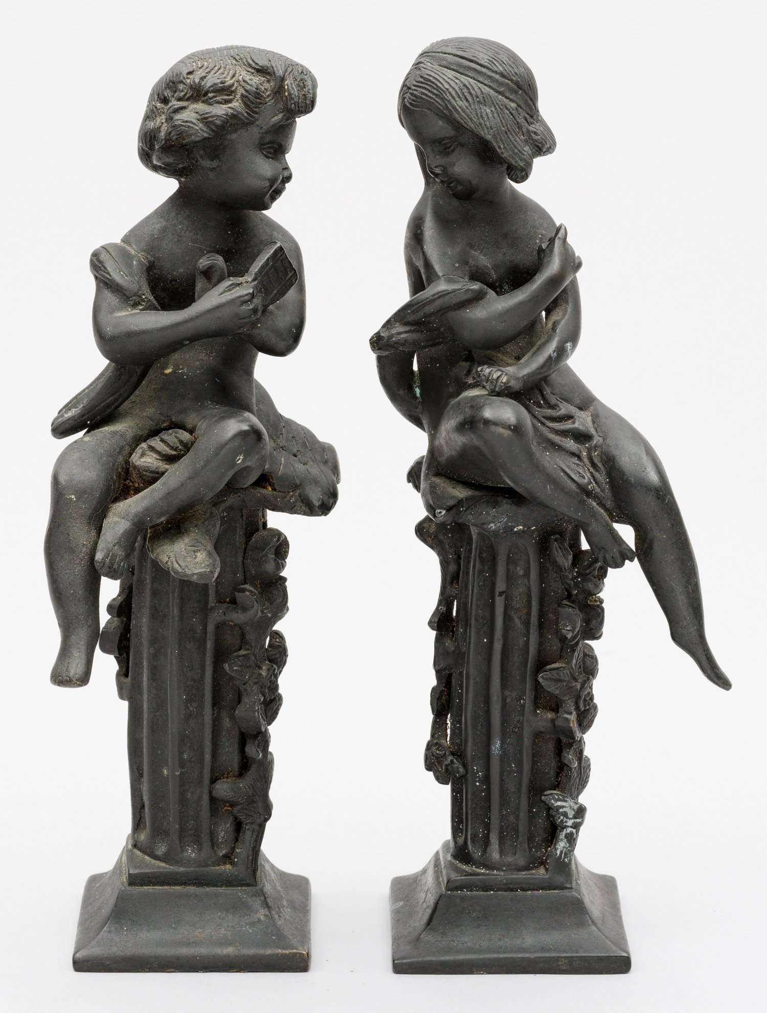Gegenstücke. Eisenguss, geschwärzt. Auf Rechteckssockel mit kanneliertem, blattreliefierten Säulenstumpf sitzendes, nach rechts blickendes Mädchen sowie ihr zugeneigter Junge mit Buch. H. 27,5 cm.
