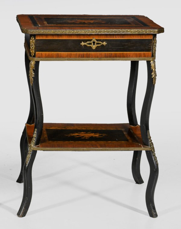 Nussbaum und Rosenholz, furniert sowie teilw. ebonisiert. Rechteckiger Zargenkasten mit angeschrägten Ecken auf geschwungenen Beinen, unterhalb durch Ablagefach verbunden. Aufklappbare Deckplatte. Unterhalb Facheinteilung. Altersspuren. H. 77 cm. 54 cm x 38 cm.
