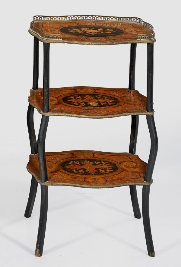 Nussbaum, furniert und teilw. ebonisiert sowie Einlagen aus unterschiedlichen Hölzern. Geschwungene Rundstäbe als Träger für passig geschweifte Ablageflächen mit Reserven aus Blattkartuschen. Durchbrochen gearbeitete Galerierahmung. Altersspuren. H. 79 cm. 45 cm x 33 cm.