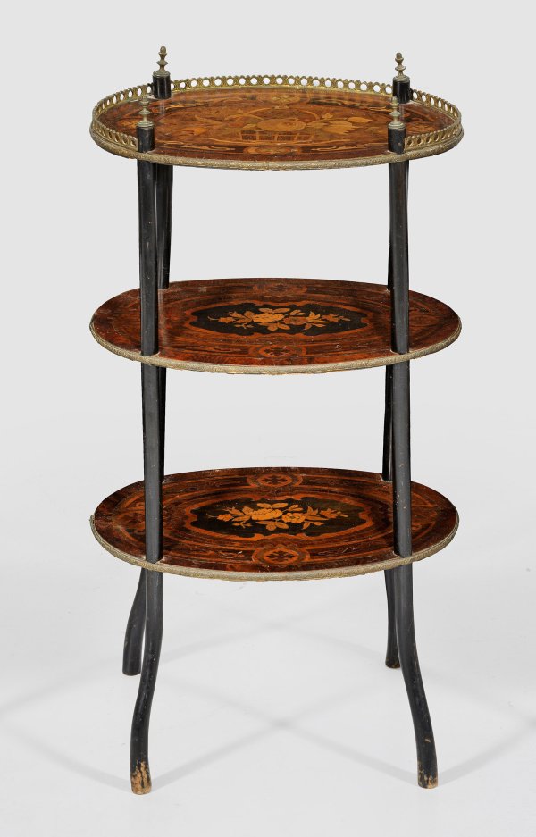 Nussbaum, furniert und teilw. ebonisiert sowie Einlagen aus unterschiedlichen Hölzern. Teilw. geschwungene Rundstäbe als Träger für ovale Ablageflächen mit breit gerahmten Reserven aus Blüten. Durchbrochen gearbeitete Galerierahmung. Altersspuren. H. 79 cm. 42 cm x 33 cm.