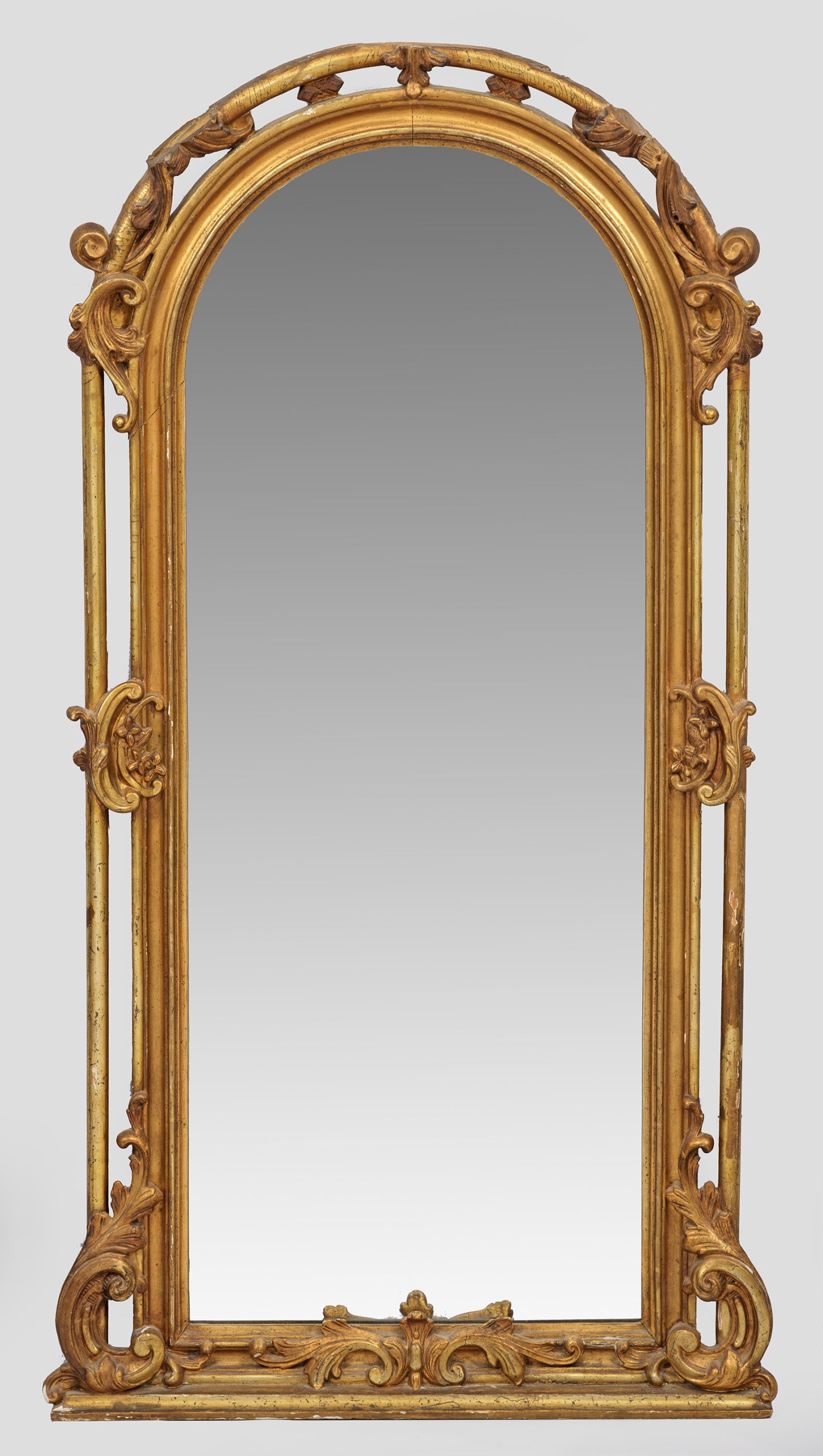 Holz, geschnitzt, gefasst und vergoldet. Gerade, hochrechteckige, profilierte und durchbrochen gearbeitete Spiegelrahmung mit erhaben reliefierten Volutenspangen sowie hochgewölbtem oberen Abschluss. Unvollständig. 162 cm x 89 cm.