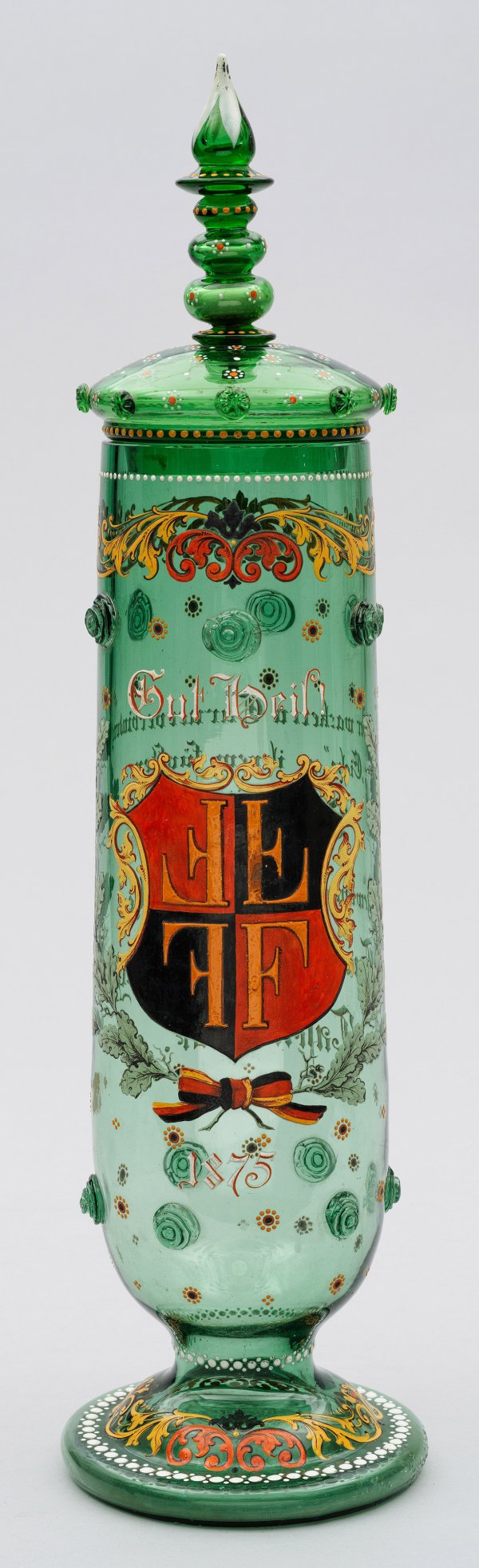 Gefußte Stangenform, aufgewölbter Deckel mit mehrfach genodetem Knauf. Grünes Glas, zwei Reihen plastische Ornamente an der Wandung. Polychrome Emailmalerei mit schauseitigem Wappen und Text "Gut Heil! 1875" sowie rücks. Text "Der wackeren Turnverbindung "Eiche" zu ihrem fünften Stiftungsfeste gewidmet von der deutschen Turnerverbindung Tafelrunde." Minim. best.; Deckelknauf besch.; H. 63 cm.