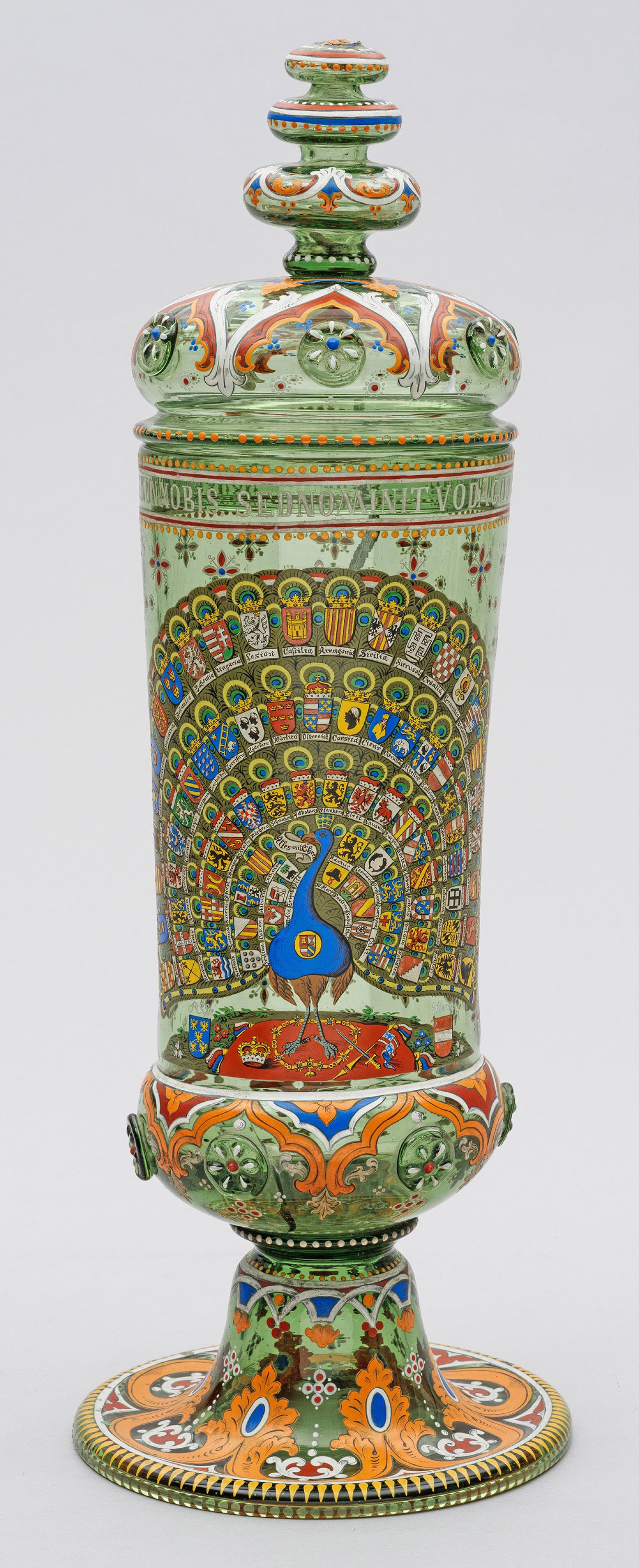 Grünes Glas. Gefußte, am Ansatz gebauchte Stangenform, aufgewölbter Deckel mit mehrfach genodetem Knauf. Polychrome Emaillemalerei, schauseitig mit radschlagendem Pfau und zahlreichen regionalen Wappen, rücks. ornamentierte Kartusche. Lateinische Schriftzeile den Rand umlaufend. Besch.; H. 60 cm.