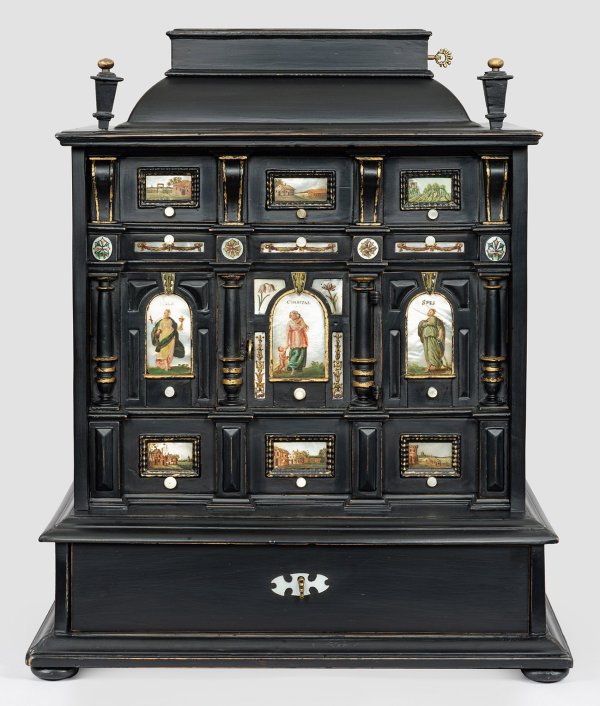 Holz, schwarz gefasst und teilw. vergoldet sowie Perlmutter, polychrom bemalt. Über einschübigem, profilierten Zargensockel und gedrückten Füßen, rechteckiger Korpus mit geschweift ansteigendem, podestförmigem oberen Abschluss mit Lade. In der architektonisch gegliederten Front zentrale Tür, umgeben von diversen Schubfächern unterschiedlicher Größe. Eingelassene Perlmuttplaketten mit weiblichen, allegorischen Figuren sowie Landschafsdarstellungen. Rest.; H. 49,5 cm. 41 cm x 25 cm.