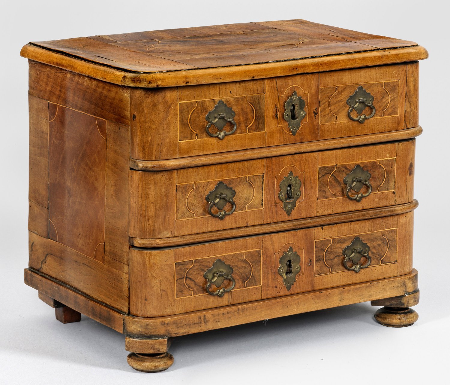 Nussbaum, furniert. Gerader, rechteckiger Korpus mit gerundeten Ecken auf gedrückten Füßen. In der gegliederten Front drei Schubladen. Gering überstehende Deckplatte. Verschlossen. Kein Schlüssel. H. 33 cm. 40 cm x 27 cm.