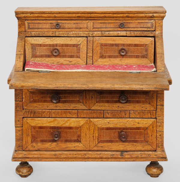 Eichenholz, furniert. Gerader, rechteckig angelegter Korpus auf Kugelfüßen. In der gegliederten Front zwei Schubladen sowie schräggestellte, abklappbare Arbeitsfläche. Podestförmiger, einschübiger oberer Abschluss. H. 38,5 cm. 39 cm x 22 cm.