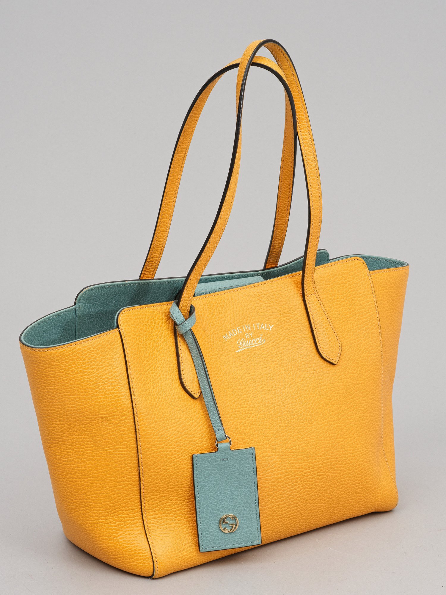 A light yellow and light blue leather tote bag by GUCCI. Manufacturer's mark. Dust bag.