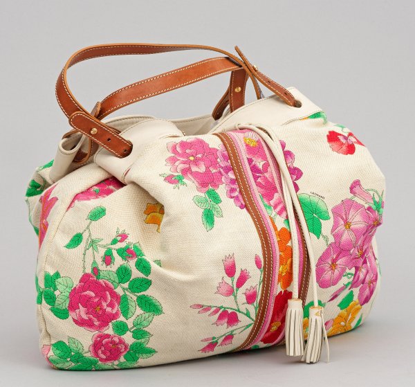Weißes Glattleder sowie naturfarbenes Wildleder mit gelben, pink-, orange- und violettfarbenen Lackelementen in Krokooptik. Silberfarbene Hardware. Gerundeter Korpus mit zwei Handhaben. Zwei Hauptfächer und diverse Nebenfächer. Herstellerzeichen. Staubbeutel. H. 23 cm. 34 cm x 17 cm.