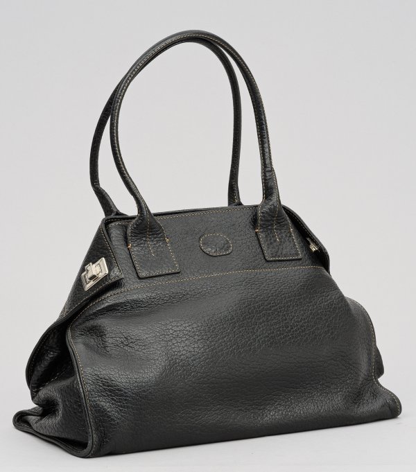 Schwarzes, genarbtes Leder. Konisch verlaufender Korpus mit zwei Handhaben. Großes Innenfach. Herstellerzeichen. Gebrauchsspuren. Taschen-H. 24 cm. 40 cm x 18 cm.