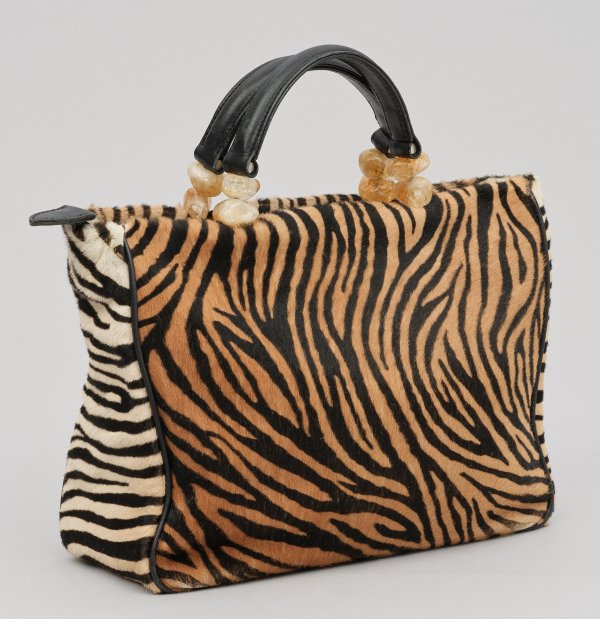 Schwarzes Leder sowie cremefarbenes Kalbsfell mit Zebradesign. Rechteckiger Korpus mit Reißverschluss und zwei Handhaben. Großes Innenfach mit Nebenfach. Herstellerzeichen. Taschen-H. 20 cm. 27 cm x 9 cm.