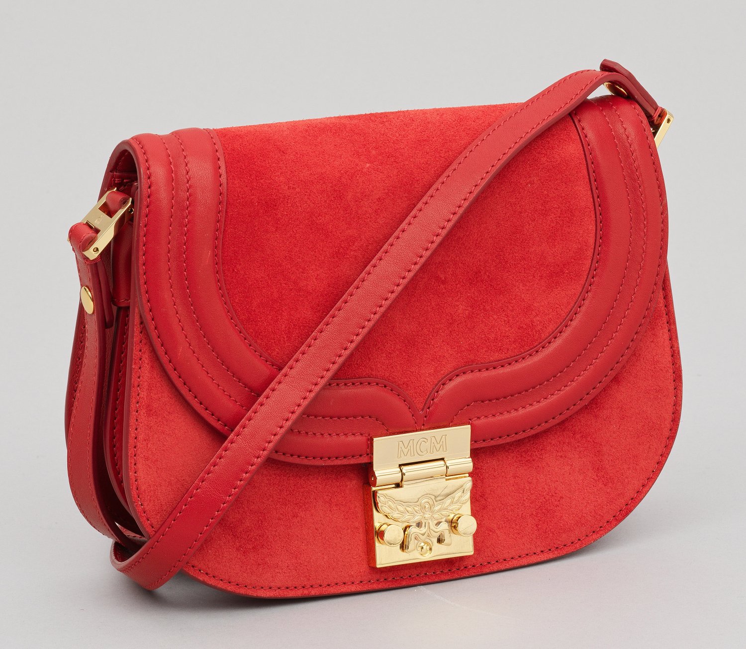 A red leather bag by MCM. Manufacturer's mark. Dust bag.