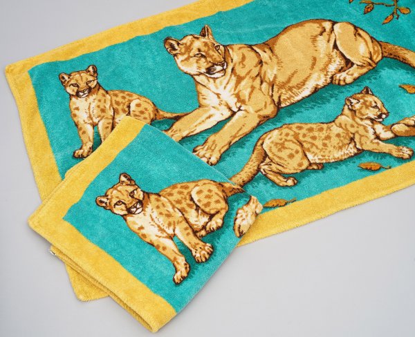 Two vintage Hermès terry cotton bath towels depicting a puma family. Brand logo. Signs of use.