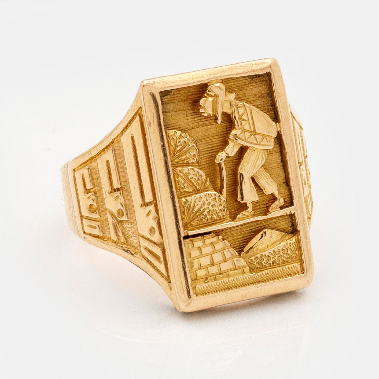 Gelbgold, gest. 750. Ornamentaler Gravurdekor, im Siegel erhabene szenische Darstellung eines Mayas zwischen Tempelruinen. Gew. ca. 9,61 g.