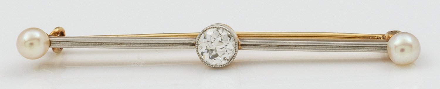Gelbgold, teilw. mit Silber verbödet, gest. 585. Zentral besetzt mit einem Altschliffdiamanten von ca. 0,80 ct., flankiert von 2 cremefarbenen Zuchtperlen von ca. 4,8 mm. Gew. ca. 5,43 g.