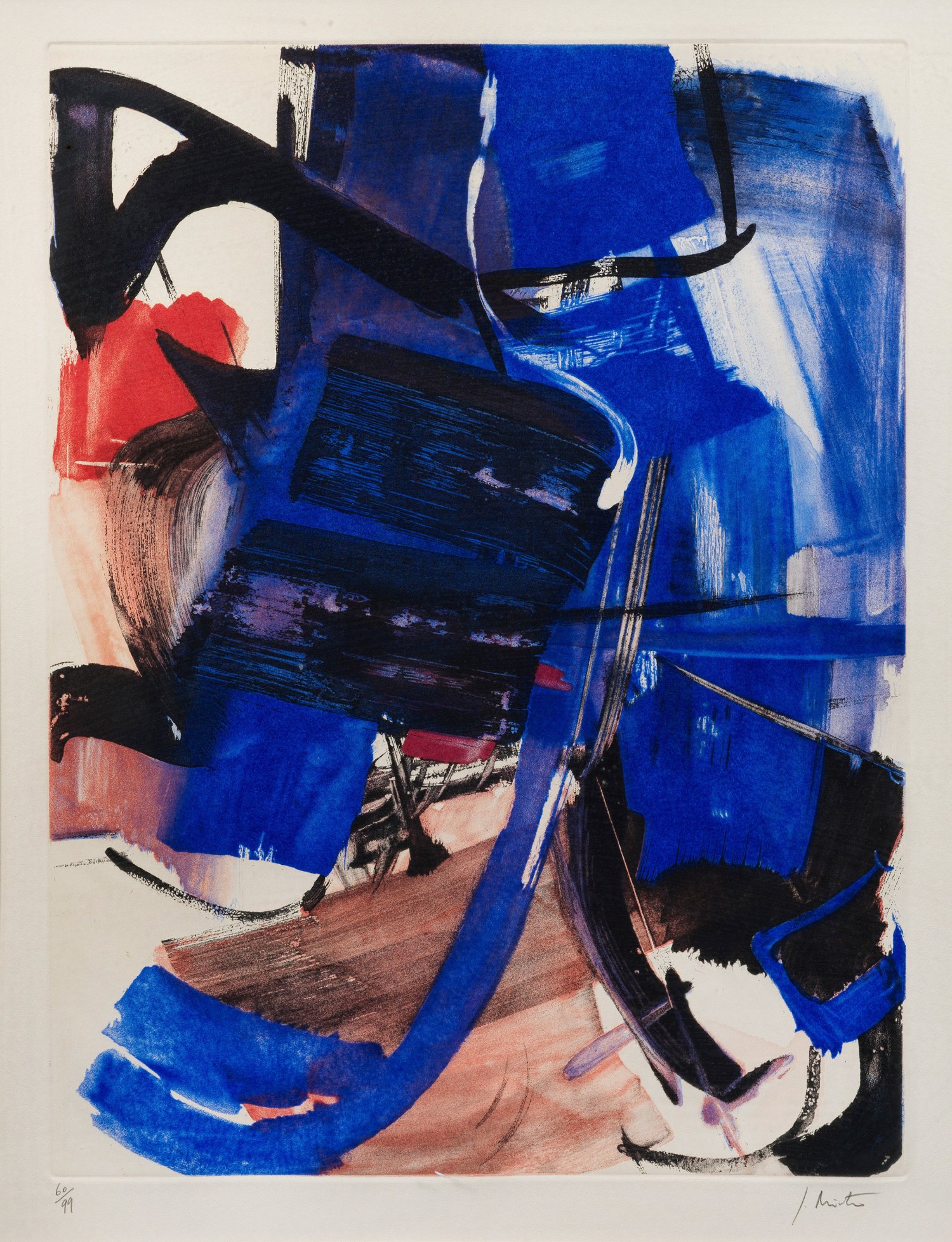 Farbaquatinta/Velin. Sign. u. nummeriert 60/99. Dynamisches Blatt Miottes, der in den 1950er Jahren zu den bedeutenden, ersten Künstlern des Informel gehörte. Plattenmaß 59 cm x 44,3 cm. Blatt ca. 88,5 cm x 71,5 cm. Rahmen.